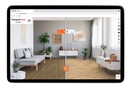 ¿Le cuesta decidir entre dos suelos? Con nuestro práctico control deslizante puede comparar fácilmente los suelos. De esta manera, descubrirá qué suelo se adapta mejor a su espacio y a su interior. Un suelo de espiga puede quedar muy bien en los muros de inspiración que ha recopilado, pero un suelo de tablones rústicos podría quedar mejor. Nuestro visor de habitaciones despejará sus dudas.