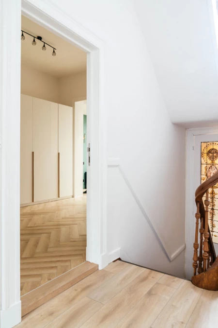 La pareja eligió la colección Yukon Mistral Herringbone y la combinó con la Yukon Mistral normal. Estas colecciones se caracterizan por sus colores suaves y naturales, así como por una estructura de madera relajada, con nudos por aquí y por allá. En el vestíbulo y en el cuarto de baño optaron por lamas rectas; en los dormitorios se instalaron suelos en espiga para aportar un efecto más chic y elegante. An: «Tenía la fijación en poner un suelo de espiga. Encaja perfectamente con los elementos auténticos de nuestra casa señorial, pero también con nuestros muebles contemporáneos».