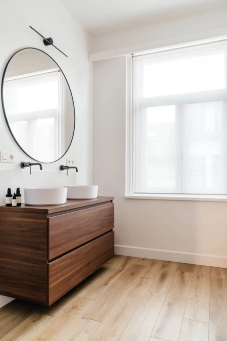La instalación no la hicieron ellos mismos. Erik: «Somos bastante torpes y un diseño en espiga no es tan fácil de instalar. Así que, para evitar despilfarros y mantener el ritmo, recurrimos a la ayuda de expertos». También se tenían que nivelar los suelos, algo que no podíamos hacer nosotros mismos. Por comodidad, elegimos tablas rectas en el pasillo y en el cuarto de baño, más fáciles de instalar en estos espacios reducidos. Parquetvinyl es un suelo completamente impermeable, ¡muy práctico!