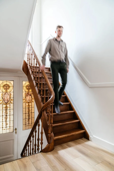 A Erik le encantan los interiores modernos, mientras que a An le apasionan los elementos auténticos y el encanto. Una casa señorial les pareció un excelente compromiso. La puerta principal de hierro forjado, la escalera de madera con carácter y otros bellos elementos, como la claraboya y las puertas pintadas, les permitieron mantener el resto del interior bastante sobrio. An: «Vivimos aquí desde hace poco, así que, por supuesto, todavía tiene que «crecer» un poco en cuanto a mobiliario. Pero, ¡todo a su tiempo!».