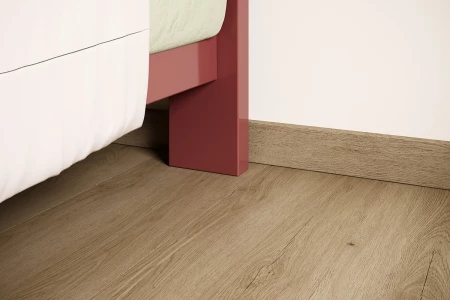 Desde nuestro suelo de vinilo acústico más claro hasta nuestro suelo de espiga más oscuro, tenemos el rodapié a juego para cada color y colección. Los rodapiés decorativos de Parquetvinyl tienen una altura de 6 cm y están acabados con una laca texturizada para conseguir un aspecto idéntico al de tu suelo. Dato curioso: si colocas el rodapié decorativo en el suelo, verás una diferencia de color que desaparece cuando lo colocas contra la pared. Esto tiene que ver con la incidencia de la luz. Por lo tanto, siempre tienes que juzgar un rodapié en el plano en el que lo vas a instalar.